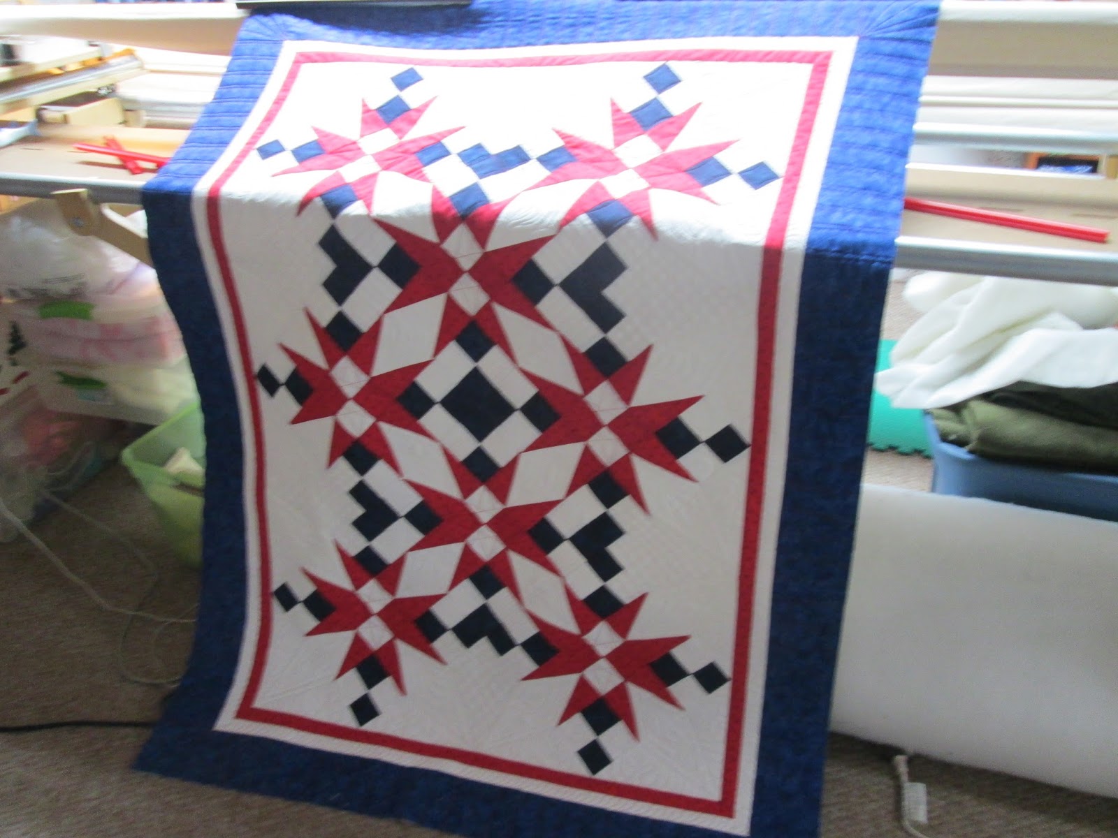 My customer is fairly new to quilting, but not sewing. She was an instructor for fashion sewing for many years, consequentially, she can definitely think outside of the box! Her ideas are incredible, but her execution needs quite a bit of work. I'm guiding her as we go along because I see some major awards in her future. Anyway, her quilt was poofy in spots, points didn't match closely, & of course, wavy borders. Not too bad on the borders though, she's improving.